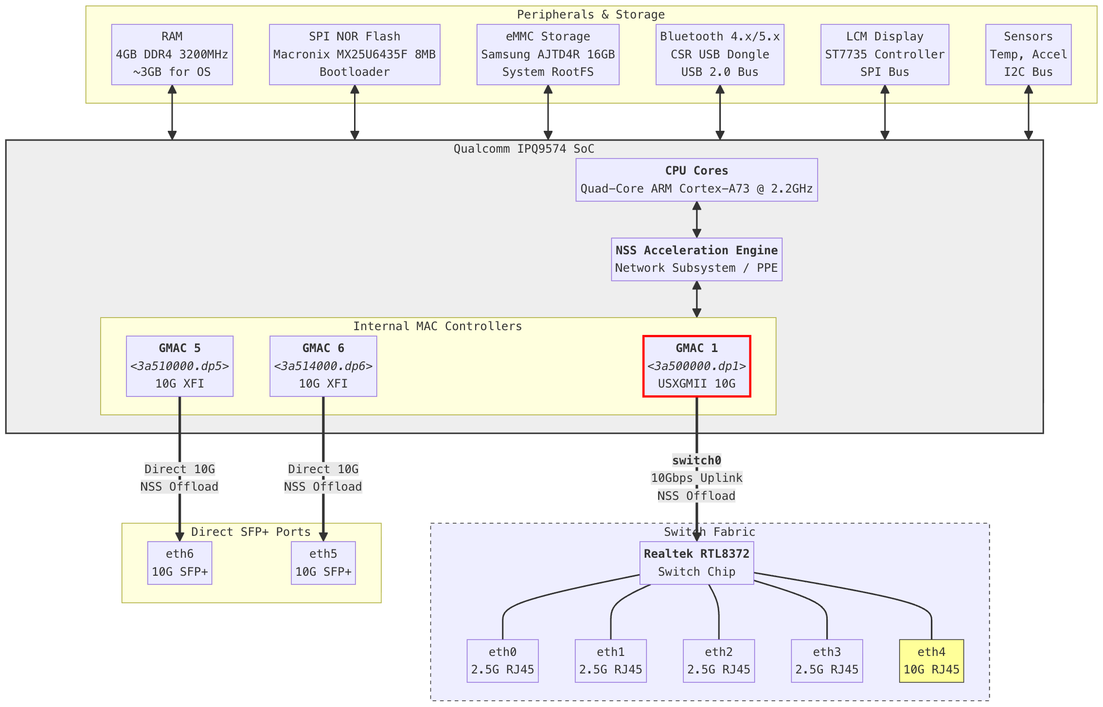 拓扑方面,两个 10G 光口直连 SoC,所有电口(4×2.5G + 10G)连接到内部的 RTL8372 交换芯片,共享一个 10G 链路到 SoC。由于有硬件加速,光口和电口的交换不会占用CPU,但电口侧确实存在带宽瓶颈(虽然一般遇不到)。