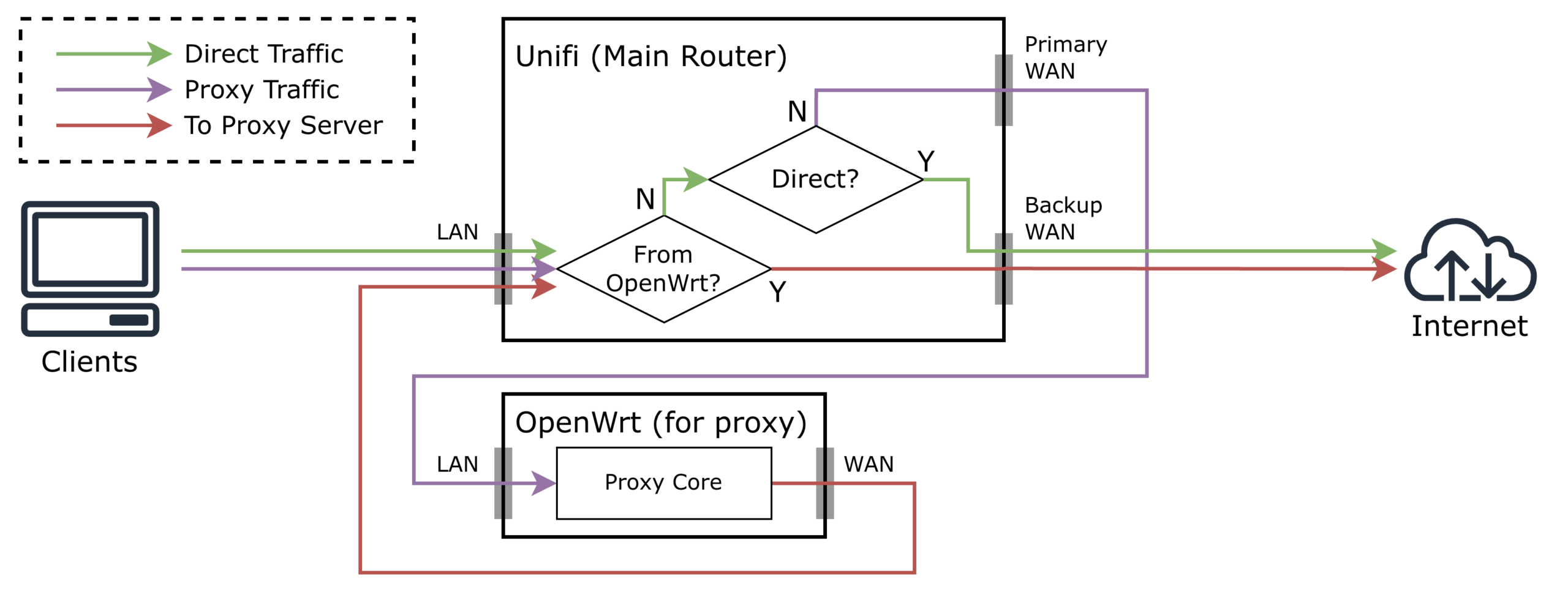 - 效果:正常情况下,客户端的 DNS 请求先到 Unifi 的 DNS 服务器上(对于 DPI 功能有帮助),然后走 WAN1 -> OpenWrt 的无污染 DNS,解析得到国外地址继续走 OpenWrt 做代理(OpenWrt 再通过 Unifi LAN -> PPPoE 连接代理服务器),国内地址直接走 PPPoE 发出。一旦 OpenWrt 挂掉,Unifi 检测到 WAN1 不通,会自动把全部路由和 DNS 都切换到 PPPoE,实现自动降级直连
